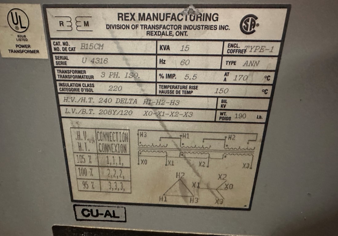 REX 15KVA TRANSFORMER HV:240 LV:208Y/120