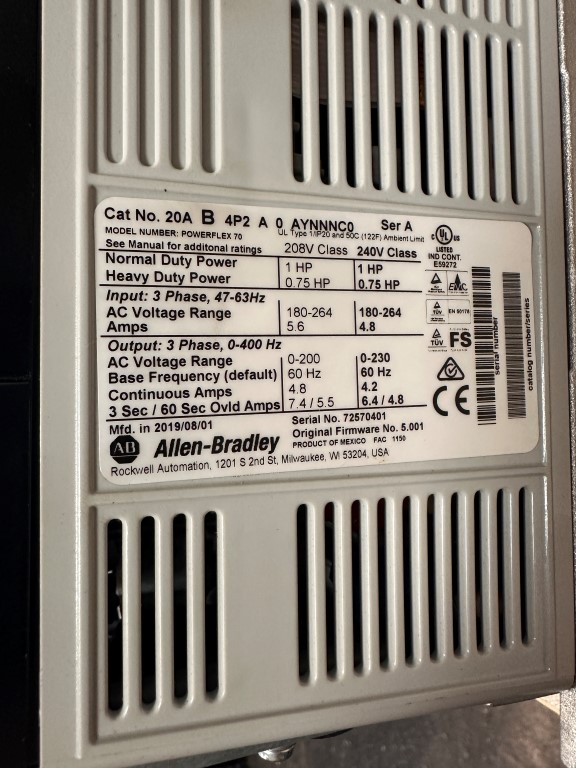 ALLEN-BRADLEY POWERFLEX70 1HP VARIABLE SPEED EQUIPPED WITH: