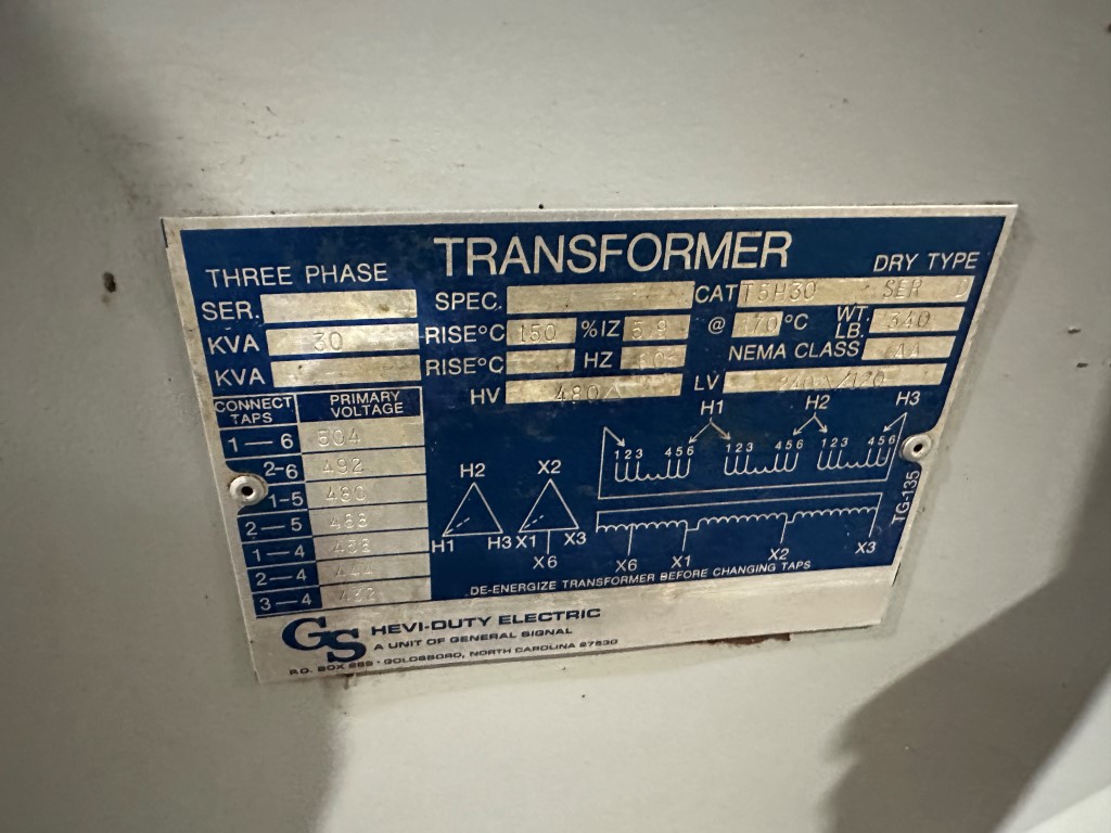 HEVI-DUTY 30KVA TRANSFORMER EQUIPPED WITH: