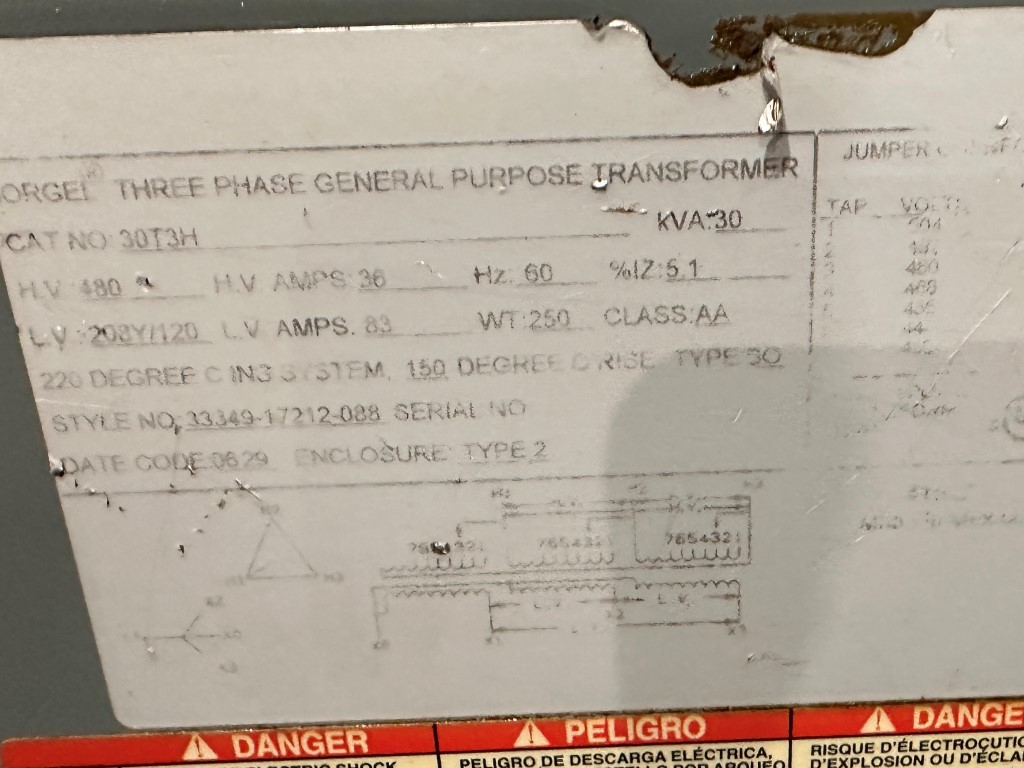 SQUARE D 30KVA TRANSFORMER HV:480 LV:208Y/120 EQUIPPED WITH: