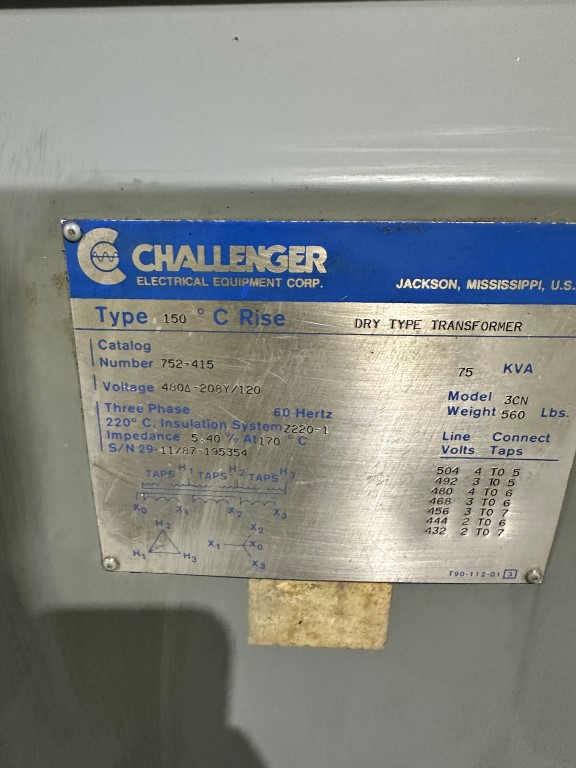CHALLENGER 75KVA TRANSFORMER HV:480 LV:208Y/1 EQUIPPED WITH: