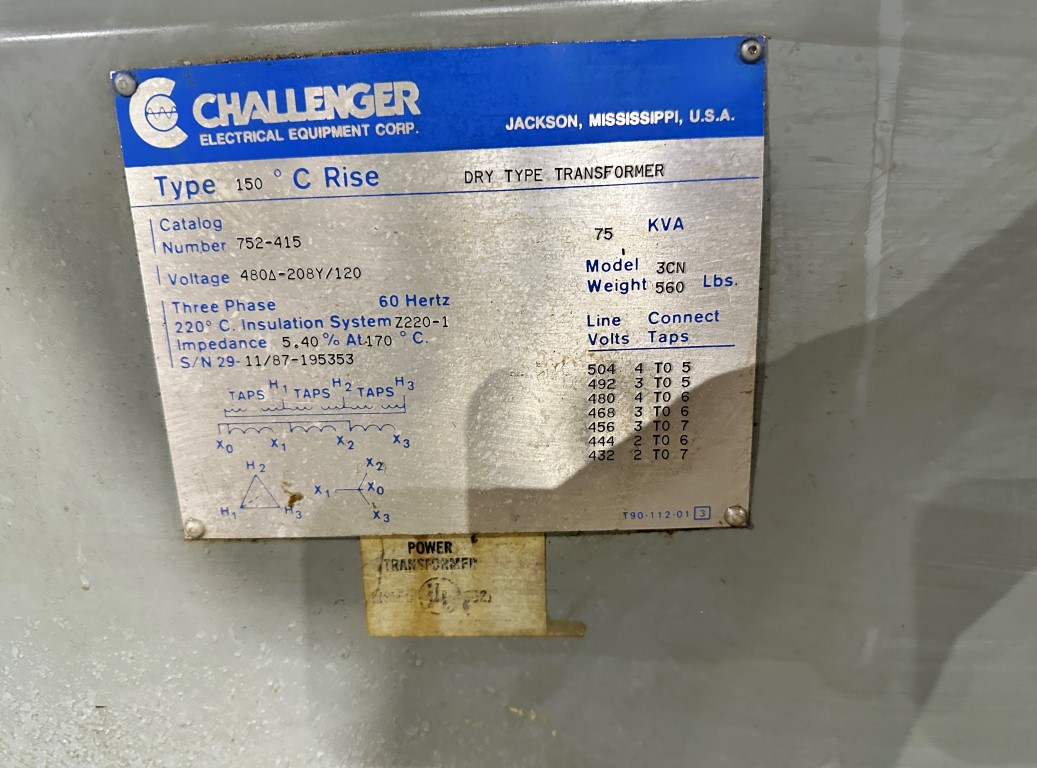 CHALLENGER 75KVA TRANSFORMER HV:480 LV:208Y/1 EQUIPPED WITH: