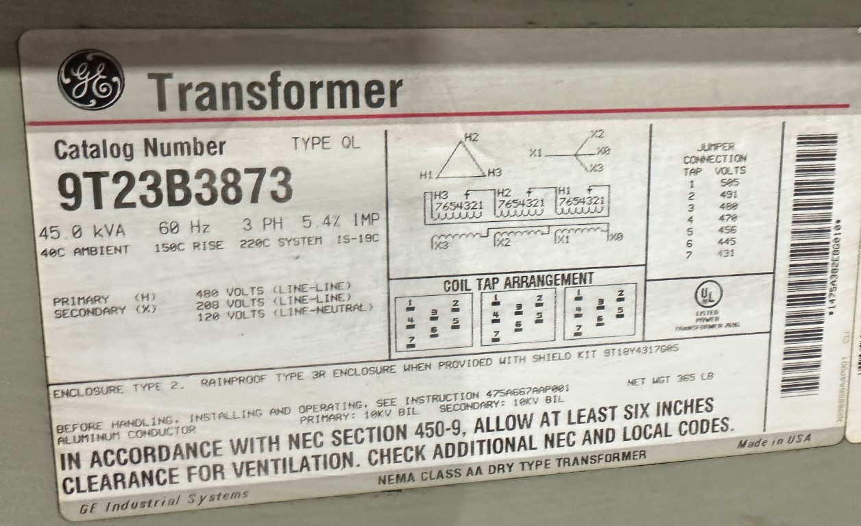GE 45KVA TRANSFORMER HV:480 LV:208Y/120 EQUIPPED WITH: