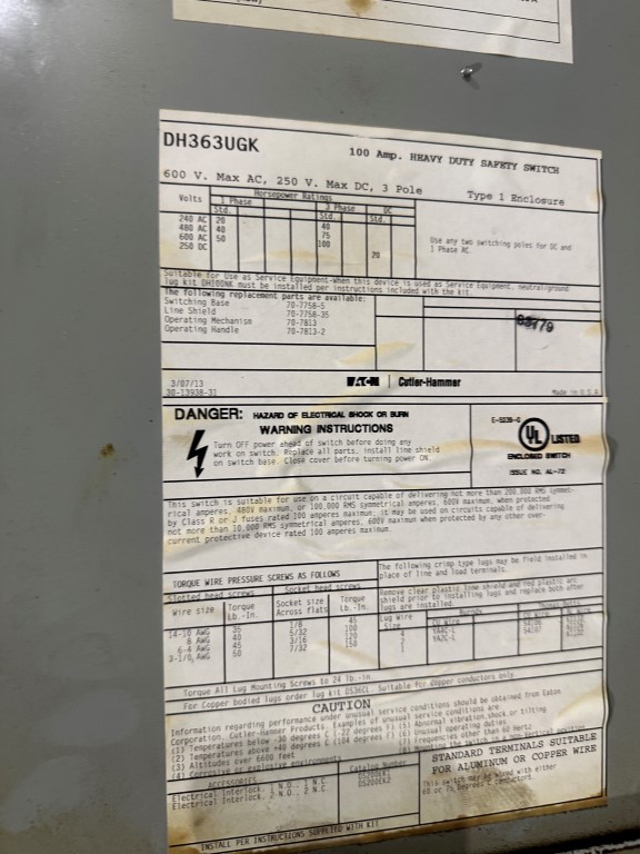 EATON DH363UGK 100AMP SAFETY SWITCH DISCONNEC EQUIPPED WITH: