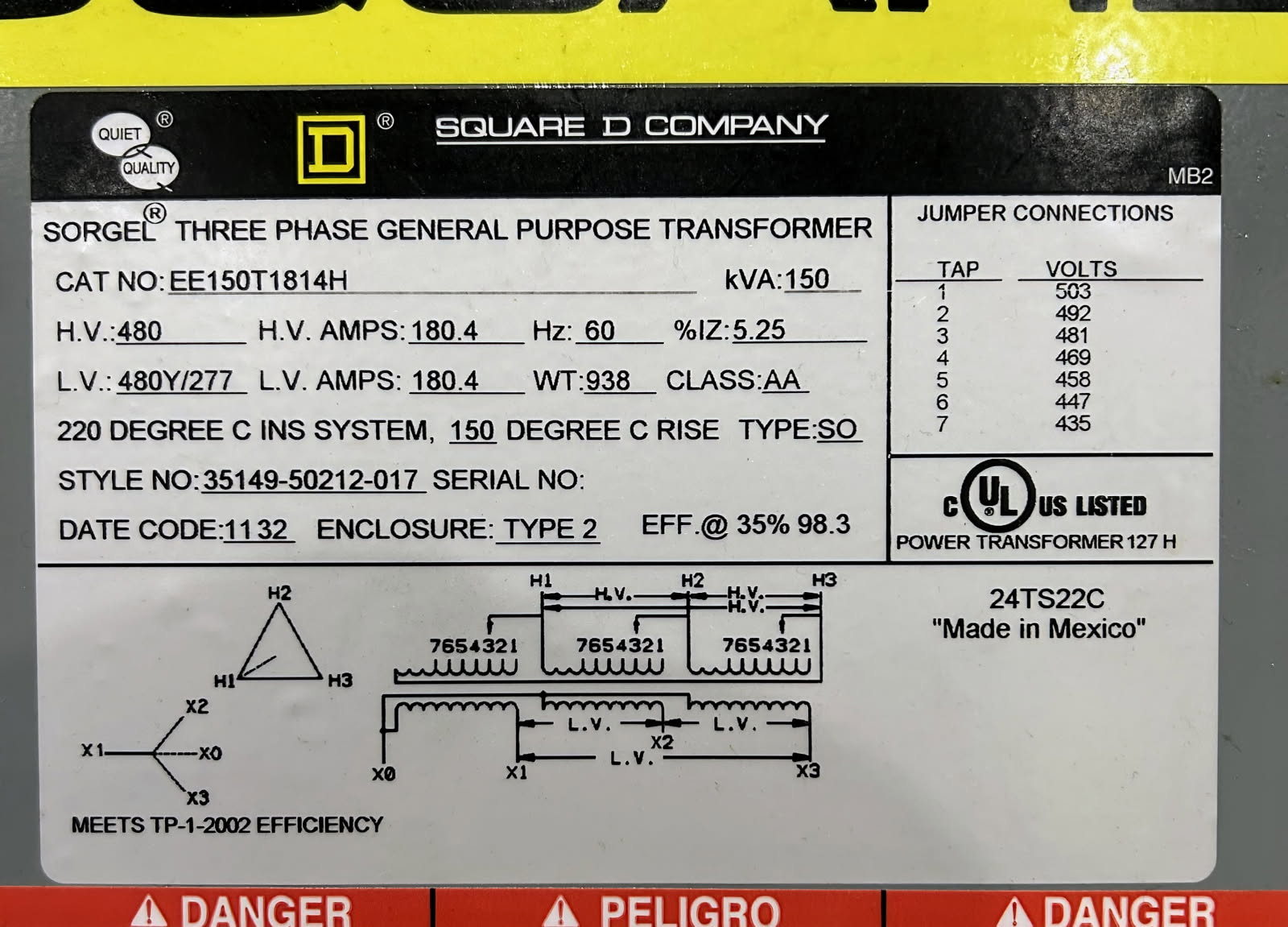 SQUARE D 150KVA TRANSFORMER HV:480 LV:480Y/27 EQUIPPED WITH: