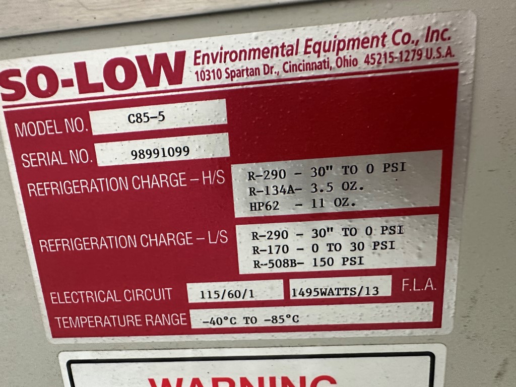 SO-LOW C85-5 -85C ULTRA LOW FREEZER EQUIPPED WITH: